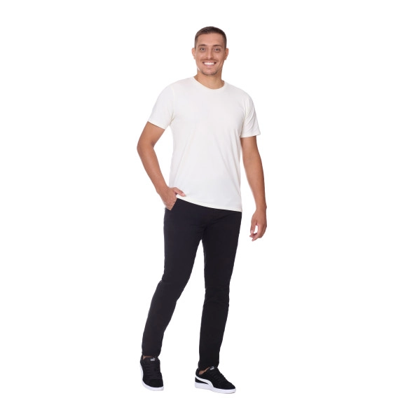 Camiseta confeccionada em malha pima, decote redondo com acabamento em ribana, estampa frontal em alto-relevo, estampa etiqueta interna e mangas curtas.
