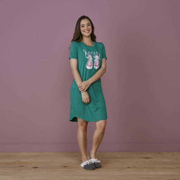 Camisola Tênis Verde Tatá Martello, pijama Tatá Martello modelo camisola confeccionado na malha viscolycra, manga curta, estampa exclusiva. Composição: 96%Viscose 4%Elastano.