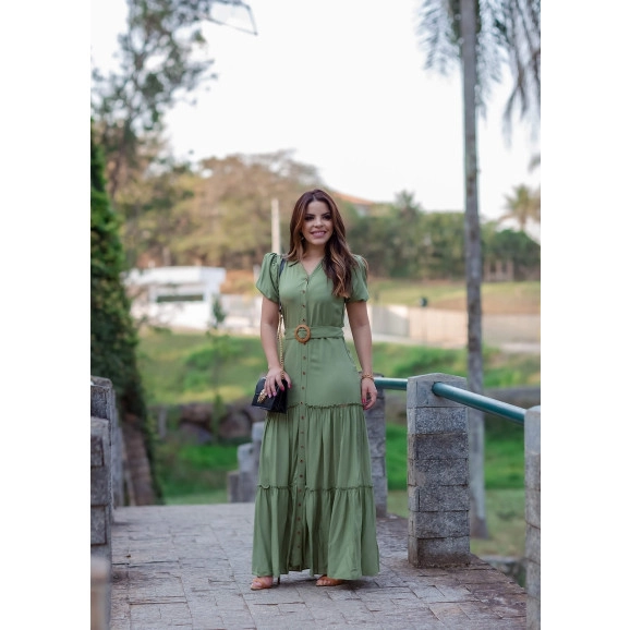 30718 VESTIDO LONGO CHEMISIER DECOTE REGULAR - Viscose - Não possui elastano - Tem forro - Acompanha cinto - Tem passante - Zíper na lateral - Botões funcionais - Facilidade para amamentar - Botões da saia decorativos - Tem ombreira - Elástico na manga - Sem fenda - Barra feita COMPOSIÇÃO: 100% VISCOSE