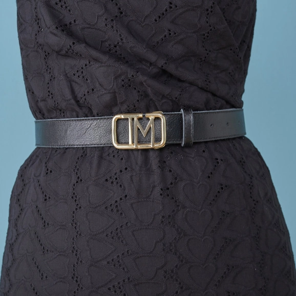 Cinto em Couro Preto Tatá Martelo confeccionado em couro legítimo com fivela personalizada (TM) em dourado (6cm).