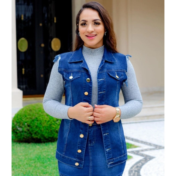 Colete Desfiado Najila Jeans. Bolso de enfeite na frente, detalhe desfiado. Para as apaixonadas por looks mais despojados! -