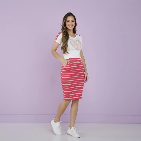 Conjunto Tatá Martello Alana. Confeccionado na malha viscolycra, blusa manga curta, decote arredondado com aplicação de termocolante. Saia com cintura em elástico, possui bolsos laterais funcionais, forrada. Produzida em duas variantes de cor.
