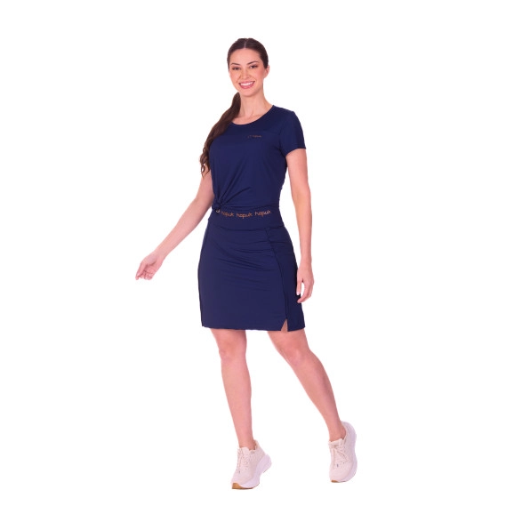 Conjunto confeccionado em malha poliamida e elas tano com proteção UV. Blusa com decote redondo, es tampa frontal e de etiqueta interna e mangas curtas. Saia shorts com cós largo, estampa frontal e de etiqueta interna, detalhe em recortes, barra com leve abertura.