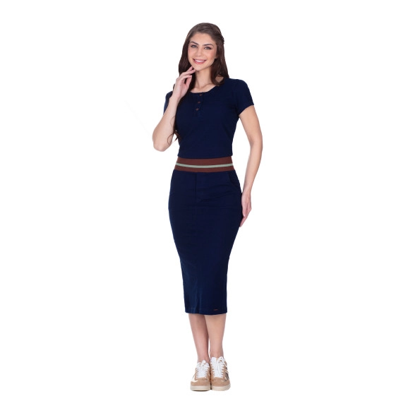 Conjunto confeccionado em malha jeans. Blusa com decote redondo, fechamento por botão pressão, detalhe em costura trançador e comprimento cropped. Saia com cós em ribana retilínea com elástico interno, bolsos funcionais e possui