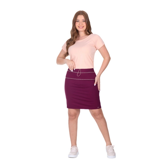 Conjunto confeccionado em malha lisa e malha texturizada com proteção UV. Blusa com decote redondo, mangas raglan, barra com elástico interno e regulador. Saia com elástico interno no cós e detalhe em costura trançador.