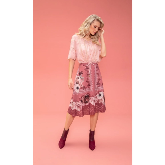 Conjunto Blusa Cropped Fasciniu's com detalhes em guipper e amarração, manga flare, saia evasê com fechamento em zíper lateral, blusa confeccionada em 80% Poliester 20% Algodão Saia e Forro 100% Poliester. Conjunto delicado e romântico, pode ser usado com scarpin ou botas.