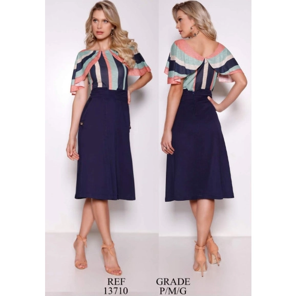 Detalhe: blusa sem manga com sobreposição, saia possui recorte diferenciado no cós, bolsos laterais, fechamento em zíper atrás. Look bem verãozinho, para você curtir o final de semana em família, ir ao culto.