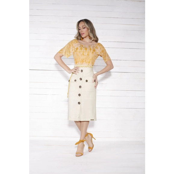 Detalhe: A blusa do conjunto é confeccionada em tule, possui babado. A Saia possui bolsos e detalhe em botões frontais, fechamento em zíper atrás. Super confortável para você que não abre mão!