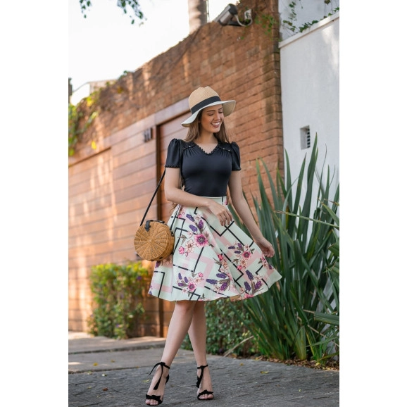 Detalhe: o body do conjunto possui bordado em pérolas na gola, e nas mangas. A saia possui modelagem godê. Look delicado e feminino, pode ser usado com rasteirinhas para um evento casual ou com salto para um evento mais formal!