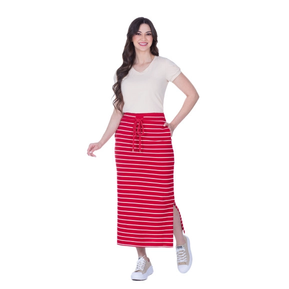 Conjunto confeccionado em malha. Blusa decote V, mangas com detalhe em prega e botão fixo. Saia elástico interno cós e detalhe em cordão fixo, bolsos funcionais, fenda lateral e possui forro.
