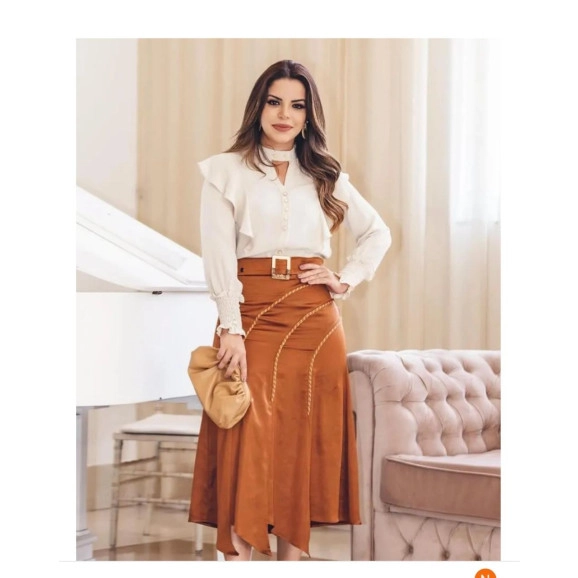 Conjunto Camisa com Babados kauly a camisa possui babados, recorte na gola, lastex no punho, fechamento em botões laterais. A saia confeccionada em alfaiataria acetinada com recortes diferenciado e detalhe em fivela, fechamento em zíper atrás. A composição da camisa, saia e forro é 100% poliester. Conjunto tendência, para você curtir a estação!