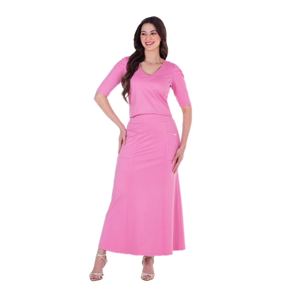 Conjunto confeccionado em ponto roma. Blusa em decote V, mangas com pregas e comprimento cropped. Saia com elástico interno no cós e bordado industrial, bolsos funcionais e possui forro.