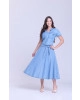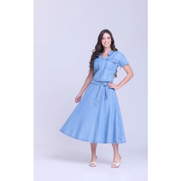 Conjunto em jeans leve. Blusa com decote em V e gola, bolsos funcionais, mangas curtas e shape cropped. Saia com cós largo e faixa fixa, fechamento traseiro por zíper metal e shape godê.