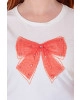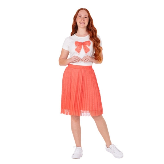 Conjunto confeccionado em malha e tule. Blusa em malha, estampa frontal localizada com aplicação de laço em tule e bordado manual e mangas com leve franzido. Saia plissada em tule, elástico interno no cós, barra a fio e possui forro.Composição: blusa 100% algodão saia 100% poliester forro saia 100% poliester.