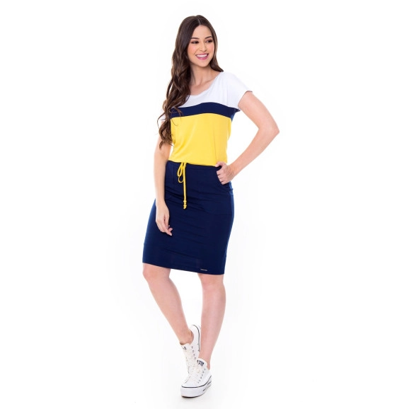 Conjunto Color Block Azul Hapuk Saia de malha, com elástico largo no cós. Possui bolsos funcionais, forro e roletê colorido. Blusa com recorte color block.Composição: 96% viscose- 4% elastano