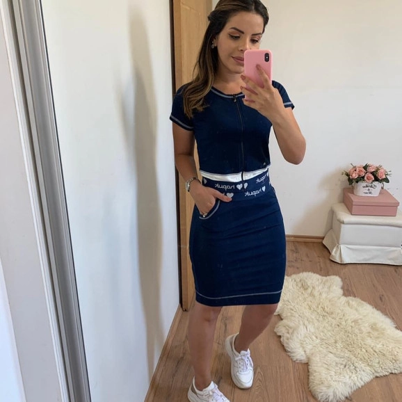 Detalhe: a blusa do conjunto possui fechamento em zíper frontal, a saia possui bolsos laterais. Look conforto, para quem não abre mão!