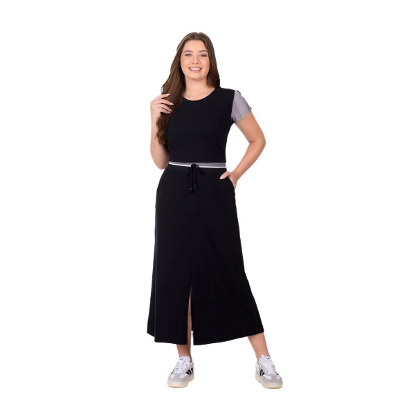 Conjunto confeccionado em malha piquet lisa e malha piquet listrada. Blusa com decote redondo em piquet liso, frente em piquet liso, costas em piquet listrado e mangas curtas com leve franzido em piquet listrado. Saia em piquet liso, elástico interno no cós em ribana retilínea, bolsos funcionais, fenda frontal e possui forro.