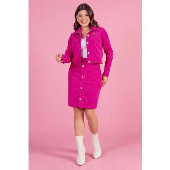 Um modelo super estiloso e atemporal, perfeito para mulheres arrasar e arrancar elogios por onde passar! Fabricado em cotelê nas cores preto e fucsia. Modelagem do blazer é acinturado e soltinho, com ótimo caimento. Sua gola é tradicional com fechamento em botões dourados personalizados. A saia tem modelagem em A com comprimento tradicional. Sua cintura é alta com bolsos laterais funcionais e botões decorativos frontais. BLUSINHA ACOMPANHA O LOOK!