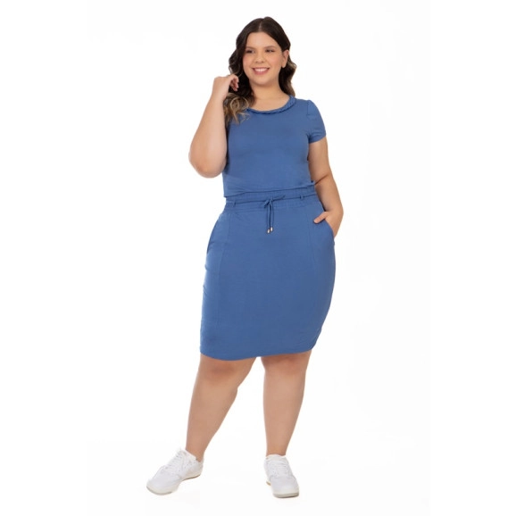 Conjunto confeccionado em moletinho, trança de viés fixa no decote, elástico interno no cós da saia e bolsos funcionais. Composição blusa 97% viscose 3% elastano | saia 97% viscose 3%