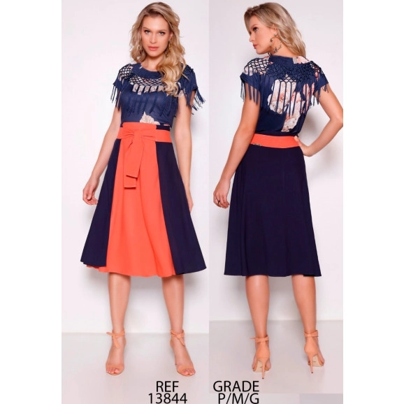 Detalhe: A blusa possui detalhe em lastex com redinha. A saia possui detalhe em amarração na cintura, fechamento em zíper atrás. Look elegante, super feminino, pode ser usado durante o dia ou a noite!