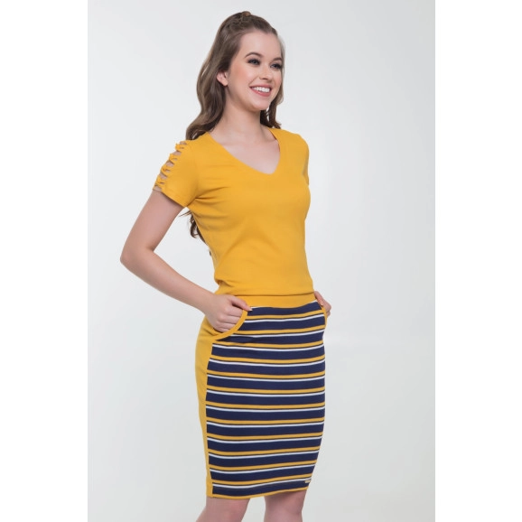Detalhe: A blusa do conjunto possui detalhe em tule e trançado nas mangas. A saia possui bolsos laterais, e listras somente na parte da frente. Para os finais de semana esse é o look ideal!