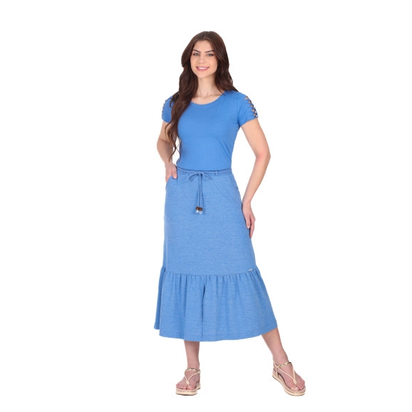 Conjunto confeccionado em malha de algodão sustentável e piquet. Blusa em malha de algodão sustentável, decote redondo, mangas com detalhes vazados e bordado manual em cristais. Saia em malha Piquet, cós com elástico interno e mini passantes, viés com ponteiras, bolsos funcionais, fenda frontal e possui forro.