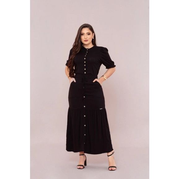 Conjunto confeccionado no tecido de viscolinho, forrado, comprimento mídi, modelo evasê com babado, detalhes de elástico, punho da manga e cós da saia, botões da camisa funcionais e da saia decorativo, bolso da saia funcional e rolete no cós de elástico P ao G1