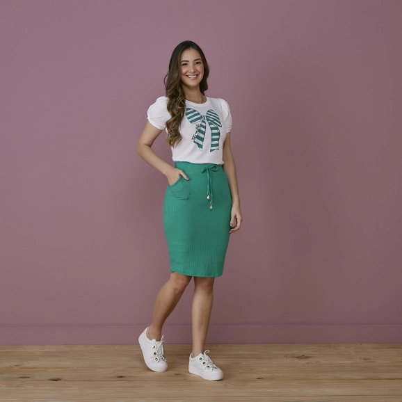 Conjunto Estampa Laço Verde Tatá Martello, saia confeccionada na malha canelada, forrada com bolsos, detalhe de amarração com ponteiras, blusa confeccionada costa e mangas na malha viscolycra e frente em crepe com estampa exclusiva, pequena abertura nas laterais, manga curta com detalhe em traspasse. Conjunto lindo e confortável, daqueles que você não vai querer tirar mais!