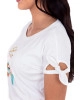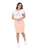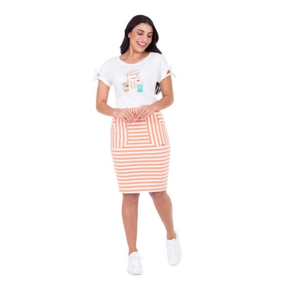 Conjunto confeccionado em malha de algodão e malha listrada texturizada. Blusa com detalhe de amarração nas mangas e estampa frontal com bordado manual. Saia com elástico interno no cós, bolsos funcionais e possui forro.