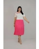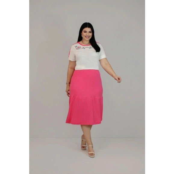 Conjunto no tecido de malha Acácia, recorte na pala do busto com bordado industrial e brincadeira de duas cores de tecido na manga e decote Saia evasê com uma mariam, e cós de elastico