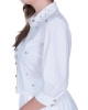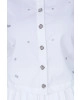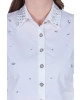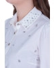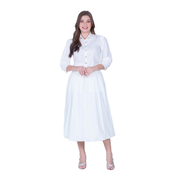 Conjunto confeccionado em tecido plano. Blusa com fechamento frontal por botões, botões funcionais nos punhos e detalhe em bordado manual frontal de pedras. Saia com shape balonê, fechamento por zíper traseiro, bolsos funcionais e possui forro.
