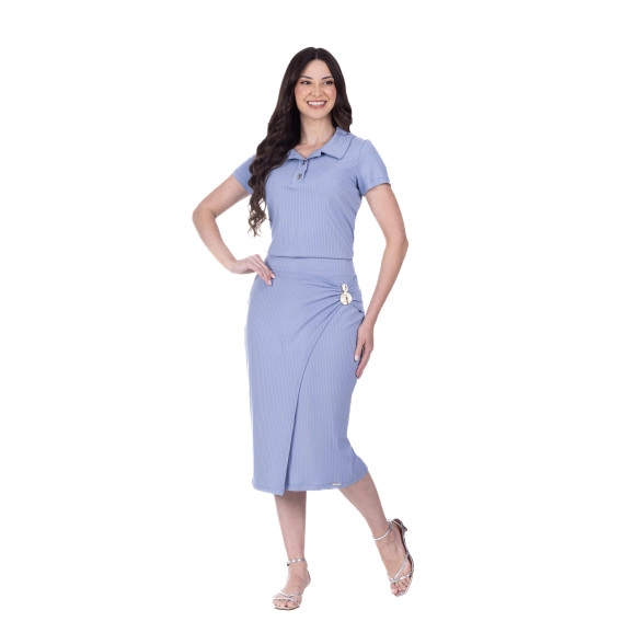Conjunto confeccionado em malha canelada. Blusa com gola e fechamento frontal por botões e mangas curtas. Saia com elástico interno no cós, detalhe fron tal com transpasse e acessório em metal, fenda trasei ra e possui forro.