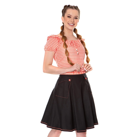Blusa em tecido plano com elástico interno no decote, barra e manga, viés fixo. Saia em linho com fechamento em zíper traseiro. Possui forro.