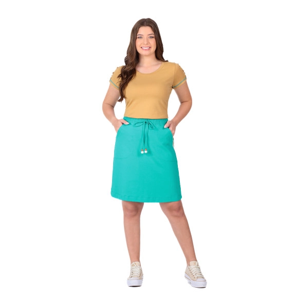 Conjunto confeccionado em malha de algodão sustentável e moletinho. Blusa em malha de algodão sustentável, decote redondo, mangas curtas com detalhe em casinha, botões e costura trançador na barra. Saia em moletinho, cós com elástico interno e viés, bolsos funcionais, detalhe em galão de malha retilínea nas laterais e possui forro.