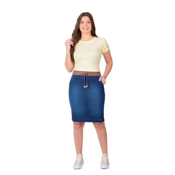 Conjunto confeccionado em malha de algodão sustentável, molecotton e malha jeans. Blusa em malha de algodão sustentável, decote redondo, mangas curtas com barra italiana e detalhe em bordado industrial. Saia em malha jeans com cós em molecotton e elástico interno, canaleta com viés, bolsos funcionais e não possui forro.