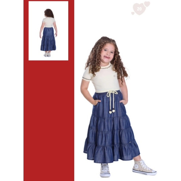 Conjunto confeccionado em malha de algodão sustentável, ribana e jeans. Blusa em malha de algodão sustentável com o decote em ribana, estampa frontal e detalhe em trançador. Saia em jeans, elástico interno no cós, cordão fixo e os bolsos funcionais.