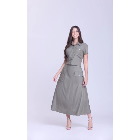 Conjunto em tecido plano. Blusa com gola no decote, fechamento frontal por botões, bolsos funcionais e mangas curtas. Saia com elástico interno no cós traseiro, bolsos funcionais e possui forro.