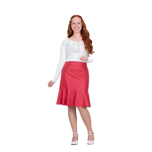 Conjunto confeccionado em malha e tecido sintético com visual de couro. Blusa em malha com zíper funcional no decote e detalhe em termocolante frontal. Saia com detalhe frontal em zíper e fechamento traseiro por zíper. blusa 100% algodão saia 100% viscose