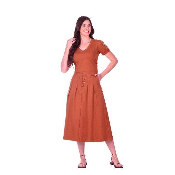 Conjunto confeccionado em malha de algodão sus tentável e malha texturizada. Blusa em malha de algo dão, decote V, mangas curtas com estampa em relevo e detalhe em babado na barra. Saia em malha texturi zada, fechamento frontal por botões, bolso funcional, detalhe em pregas e possui forro.