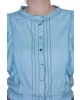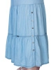 Conjunto confeccionado em jeans leve. Blusa com elástico interno formando babado e fechamento frontal por botões. Saia com elástico interno no cós, bolsos funcionais e fenda lateral com detalhe de botão.