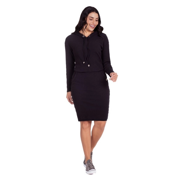 Conjunto confeccionado em malha ribana. Blusa com capuz, detalhe ilhós e acabamentos a fio. Saia com elástico interno no cós, bolsos funcionais e possui forro. Composição Blusa e saia 70% algodão 24% poliester 6% elastano Forro da saia 100% poliester