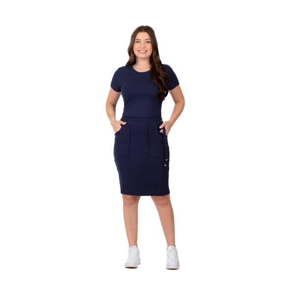 Conjunto confeccionado em malha lisa e malha canelada. Blusa em malha lisa, decote em malha canelada e detalhe em martingale e botão fixo nos ombros. Saia em malha canelada, cós com elástico interno, canaleta com viés, bolsos funcionais com detalhe em ribana em malha retilínea e possui forro.