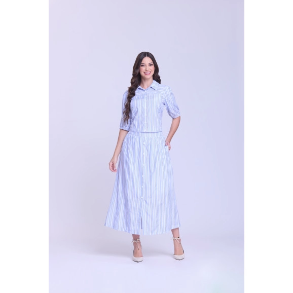 Conjunto em tecido plano listrado. Blusa com gola no decote, fechamento frontal por botões e mangas curtas com elástico interno na barra. Saia com elástico interno no cós traseiro, bolsos funcionais, vista falsa e botões e possui forro.