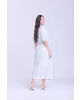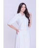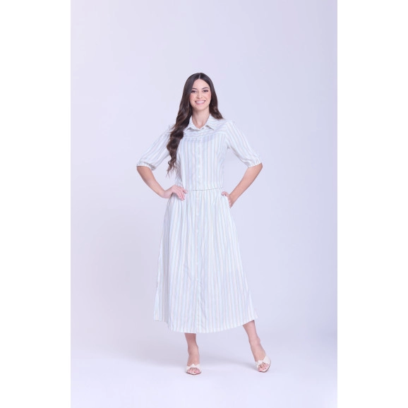 Conjunto em tecido plano listrado. Blusa com gola no decote, fechamento frontal por botões e mangas curtas com elástico interno na barra. Saia com elástico interno no cós traseiro, bolsos funcionais, vista falsa e botões e possui forro.