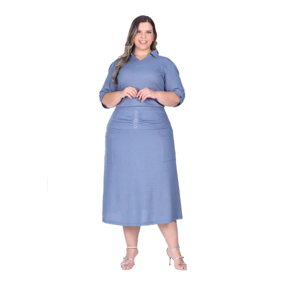 Conjunto confeccionado em malha texturizada com aspecto de tricô. Blusa com gola, mangas curtas com punhos e elástico interno. Saia com elástico interno no cós, revel falso com botões fixos, bolsos funcionais e possui forro.