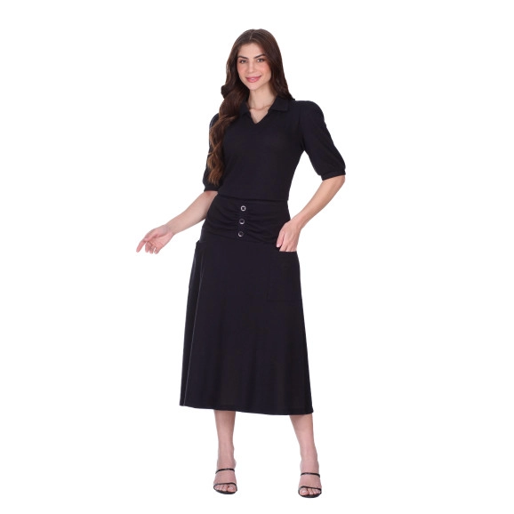Conjunto confeccionado em malha texturizada com aspecto de tricô. Blusa com gola, mangas curtas com punhos e elástico interno. Saia com elástico interno no cós, revel falso com botões fixos, bolsos funcionais e possui forro.