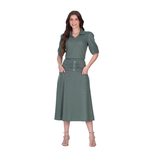 Conjunto confeccionado em malha texturizada com aspecto de tricô. Blusa com gola, mangas curtas com punhos e elástico interno. Saia com elástico interno no cós, revel falso com botões fixos, bolsos funcionais e possui forro.