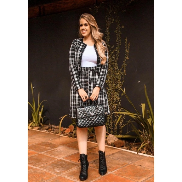 Conjunto P&B Maria Amore confeccionado em tecido tweed, o casaco possui detalhe em guipper, a saia possui detalhe em botões frontais e fechamento em zíper atrás. Composição do tecido 80%poliester 20%Acrilico. Conjunto muso, super feminino, e quentinho ideal para essa estação! Não acompanha a blusinha!