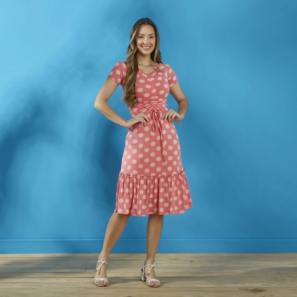 Conjunto Tatá Martello Rosa. Confeccionada na malha viscolycra. Blusa manga curta, decote ombro a ombro com detalhe rolete frontal para regulagem. Saia evasê, cós de elástico, babado na barra, forro de helanca. Produzido em duas variantes de cor. Composição: Tecido Principal 96% Viscose 4% Elastano | Forro 100% Poliéster