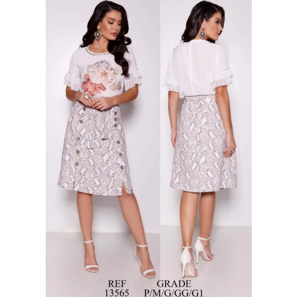 Detalhe: A blusa do conjunto possui detalhe bordado na gola e nas mangas. A saia possui detalhe em botões frontais e fechamento em zíper lateral. Conjunto elegante e feminino, ótimo para a mulher moderna que gosta de andar sempre bem vestida e confortável.